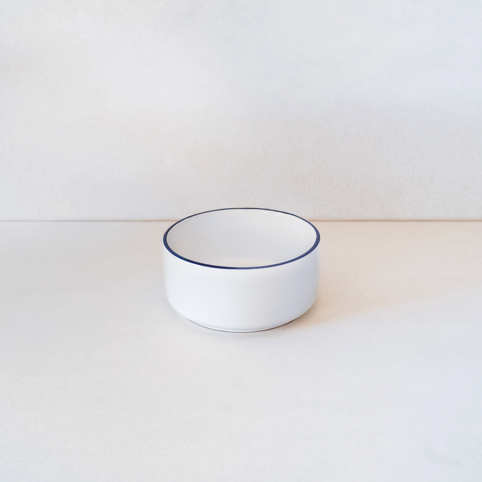 eine vielseitige schale, die sich auch für ein salat oder für apéro-snack eignet. die kombination aus klassischer form, weisse glasur und dem blauen rand macht sie zu einem besonderen hingucker.